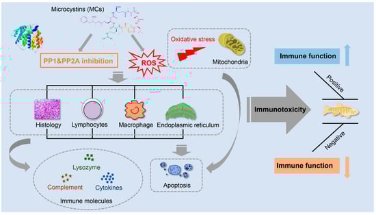 A schematic review of the immunotoxicity of MCs on fish. MCs are specific inhibitors of serine/threonine PP1 and PP2A, which result in the imbalance of phosphorylation and dephosphorylation of crucial proteins, subsequently causing abnormal cellular proliferation and cytoskeleton organization damages. MCs exposure is also related to the ROS overproduction and oxidative stress in immune organs, which results in apoptosis and immune dysfunction. MC-induced immunotoxicity greatly depends on exposure routes, time, and concentrations/doses.