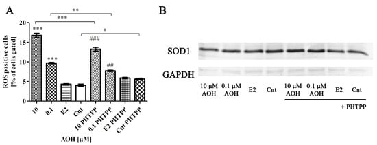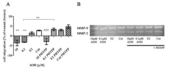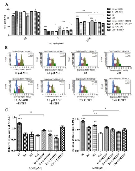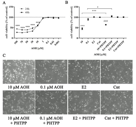| 10 µM AOH | 0.1 µM AOH | E2 | Cnt | 10 µM AOH + PHTPP | 0.1 µM AOH + PHTPP | E2 + PHTPP | Cnt + PHTPP | |