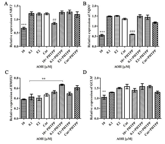 | Gene | 10 µM AOH | 0.1 µM AOH | E2 | Cnt | 10 µM AOH + PHTPP | 0.1 µM AOH + PHTPP | E2 + PHTPP | Cnt + PHTPP |