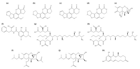 Chemical structures of the 11 mycotoxins: (a) aflatoxin B1; (b) aflatoxin B2; (c) aflatoxin G1; (d) aflatoxin G2; (e) deoxynivalenol; (f) ochratoxin A; (g) fumonisin B1; (h) fumonisin B2; (i) T-2 toxin; (j) HT-2 toxin; (k) zearalenone.