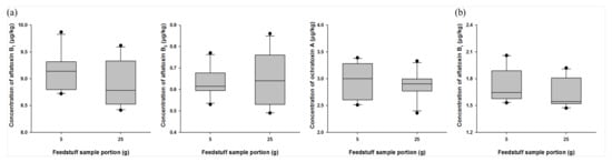 Homogeneity optimization of feed samples: (a) mix feed ingredient; (b) grain feed ingredient during sample preparation. Optimization was conducted using feed samples containing aflatoxins B1 and B2 and ochratoxin A. All samples were prepared from 1 kg of homogenized feed sample to final weights of 5 or 25 g, and this preparation was performed 10 times for each sample (n = 10).