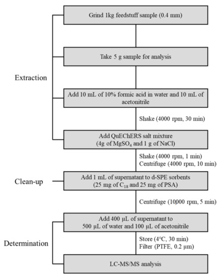 Prior to their extraction, 1 kg feed samples with representative properties were ground and homogenized using a cutting mill. About 5 g of each ground sample was extracted with 10 mL of acetonitrile and 10 mL of water with 10% formic acid in a homogenizer at 4000 rpm for 30 min. After extraction, 4 g of MgSO4 and 1 g of NaCl were added to the samples, and solutions were shaken at 4000 rpm for 1 min. Extracted samples were centrifuged at 4000 rpm for 10 min. For sample clean up, 1 mL of the supernatant obtained from centrifugation was added to a 1.5 mL centrifuge tube containing 25 mg of C18 and 25 mg of PSA and shaken at 10,000 rpm for 5 min. After centrifugation, 400 μL aliquots of supernatant were transferred into a 1.5 mL centrifuge tube and mixed with 500 μL of distilled water and 100 μL of ACN, which was stored in the refrigerator at 4 °C for 30 min. All samples were filtered using a 0.2 μm polytetrafluoroethylene (PTFE) syringe filter and stored in plastic vials. The sample extracts were analyzed by liquid chromatography–tandem mass spectrometry (LC–MS/MS) [32]. All sample preparations were performed in triplicate. The analytical flow of the optimized QuEChERS extraction method for the analysis of mycotoxins in feed samples is shown in Figure 3.