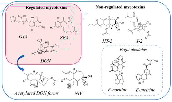 In this study, an ultra-high-performance liquid chromatography coupled to a hybrid quadrupole orbitrap mass analyzer (UHPLC-q-Orbitrap MS) method was optimized and validated in wheat, maize and rye matrices. The analyte list contained 19 mycotoxins (Figure 1), namely, 3 regulated mycotoxins (ochratoxin A, deoxynivalenol and zearalenone) and 16 non-regulated mycotoxins, including 11 ergot alkaloids (EAs). In contrast to our recent study that focused on mycotoxin determination using ambient MS [12], in which the EA concentration was reported as a sum, in this case the EA epitopes can be effectively identified and quantified. In addition, all the detected mycotoxins are considered compounds with significant toxicity, resulting in potential health effects upon certain dietary exposure. In detail, ochratoxin A (OTA) is related to hepatotoxic, teratogenic and immunotoxic effects [13], and the European Food Safety Authority (EFSA) Panel on Contaminants in the Food Chain (CONTAM Panel) recently complied a risk assessment concluding that more exposure data are needed to better understand the in vivo impact of OTA to humans [14]. Regarding mycotoxins produced by Fusarium species, deoxynivalenol (DON) and nivalenol (NIV), belonging in the type-B trichothecenes, induce ribotoxic stress, including inhibition of protein, DNA and RNA synthesis [15]. Besides DON, also its acetylated metabolites, namely, 3- and 15-acetyldeoxynivalenol (3-ADON, 15-ADON), are analytes of high interest, as they can be absorbed more rapidly than DON and be converted to the parental form during digestion [16]. In terms of zearalenone (ZEA), it has shown strong estrogenic and anabolic effects [17] whilst the T-2 and HT-2 toxins, the most prevalent type-A trichothecenes, inhibit protein synthesis and target liver and spleen functions (mostly T-2 toxin) [18]. Last but not least, EAs produced by Claviceps species can cause ergotism, one of the oldest known human diseases caused by mycotoxins [19]. All in all, the described analyte toxic potential and their occurrence in the food chain (see Section 2) indicates the need to monitor these analytes and the present study provides an efficient and reliable analytical strategy to achieve it.