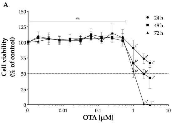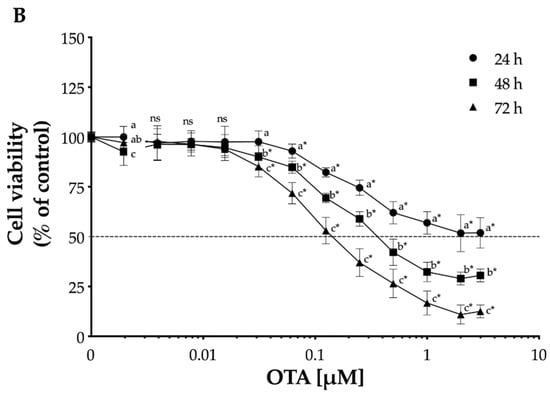 Time- and concentration-dependent cytotoxicity of ochratoxin A (OTA) in proximal tubule epithelial cells. Cell viability was determined by the reduction in MTT after incubation with OTA for 24 h (•), 48 h (■), and 72 h (▲) in LLC-PK1 (A) and HK-2 (B) cells. Values are mean (n = 3) ± standard deviation, and they are expressed as percentage of control. The dotted line (···) represents the concentration of OTA that reduced the cell viability by 50%. Different letters indicate a statistically significant difference (p < 0.05) between values within the same OTA concentration by Tukey’s multiple comparison test, while ns = non-significant. Asterisks (*) indicate a statistically significant difference (p < 0.05) between values against each group control by Dunnett’s test.