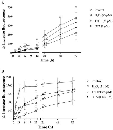 Production of reactive oxygen species by H2O2, TBHP, and ochratoxin A (OTA) in proximal tubule epithelial cells at various exposure times up to 72 h. Increase in DCF fluorescence, upon oxidation of carboxy-H2DCF, was monitored after exposure to the test compound. (A) LLC-PK1 cells H2O2 (☐ ,75 μM), TBHP (△, 28 μM), and OTA (•, 1 μM); (B) HK-2 H2O2 (☐, 2 mM), TBHP (△, 375 μM), and OTA (•, 0.125 μM). In both cell lines, non-treated controls are denoted by open circles (◯). Values are mean (n = 3) ± standard deviation, and they are expressed as percentage increase in fluorescence from time zero. Different letters indicate a significant difference (p < 0.05) between treatments at each time by Tukey’s multiple comparison test, while ns = non-significant difference.