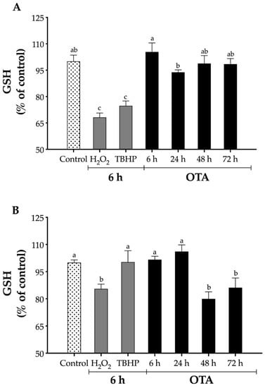 Relative levels of GSH in proximal tubule epithelial cells. GSH levels were determined by the reaction with DTBN to form 5′-thio-2-nitrobenzoic acid in cells homogenates. (A) LLC-PK1 cells H2O2 (75 μM), TBHP (28 μM), and OTA (1 μM); (B) HK-2 H2O2 (2000 μM), TBHP (375 μM), and OTA (0.125 μM). Values are mean (n = 3) ± standard deviation, and they are expressed as percentage of control. Different letters indicate a statistically significant difference (p < 0.05) between treatments at each time by Tukey’s multiple comparison test.