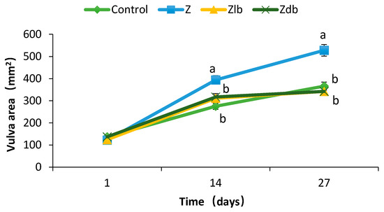 The moldy corn contaminated with ZEN negatively affected the reproductive organs of the gilts and increased the size of the vulva, while the addition of the B. subtilis ZJ-2019-1 strain into the diets prevented the gilts from damage caused by ZEN. There was no significant difference observed in the vulva sizes in any of the groups (p > 0.05), and there was no significant redness or swelling (d1–d3). Compared with the control group, the vulva size of the gilts in the Z, Zlb, and Zdb groups increased significantly (d3–d14), but the vulva size of the Zlb and Zdb gilts fed the diet containing B. subtilis ZJ-2019-1 exhibited a significant reduction compared with the vulva size in the Z group, returning to the normal state exhibited by the control group (d14–d27) (p < 0.05; Figure 1). There was no significant difference observed among the vulva sizes of the control, Zlb, and Zdb groups (p > 0.05), while vulva size in the Z group exhibited a significant increase compared with that of the control, Zlb, and Zdb groups (d14–d28) (p < 0.05).