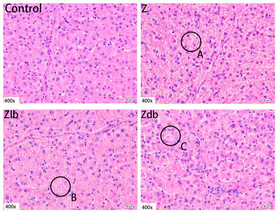 In our observation, no macroscopic pathological changes in the liver were found among the treatment groups. Through pathological tissue section analysis of liver tissue, the Z group had shallower cytoplasm, shrinkage of liver lobules, increased connective tissue, and increased inflammatory cells (Figure 2) compared to the control group. However, with the addition of the bacteria, the cell damage was reduced in the Zlb and Zdb groups (Figure 2). Compared to the control group, the Z treatment group had severe cell edema and balloon-like degeneration (Figure 3A). Compared to the Z group, liver cell edema was reduced, but granular degeneration remained in the Zlb and Zdb groups (Figure 3B,C).