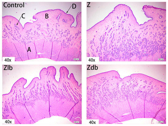 Uterus of a gilt fed a basic diet (C group), ZEN-contaminated diet (Z group), ZEN-contaminated diet with liquid of Bacillus subtilis ZJ-2019-1 (Zlb group), or fermented–dried culture of Bacillus subtilis ZJ-2019-1 (Zdb group) (HE stained, 40×). (A) muscle layer; (B) intima; (C) gland; (D) epithelium.