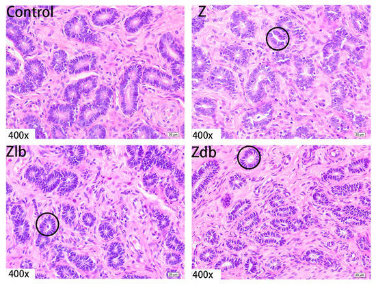 Uterine glands of a gilt fed a basic diet (C group), ZEN-contaminated diet(Z group), ZEN-contaminated diet with liquid of Bacillus subtilis ZJ-2019-1 (Zlb group), or fermented–dried culture of Bacillus subtilis ZJ-2019-1 (Zdb group) (HE stained, 400×).