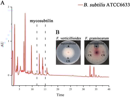 Purification and antifungal assay of mycosubtilin from B. subtilis ATCC6633. (A) Mycosubtilin was isolated from the crude extract of B. subtilis ATCC6633 using semipreparative reverse-phase HPLC. AU (absorbance unit). (B) Assay of antifungal activity using purified mycosubtilin against F. graminearum and F. verticillioides. CK (control), methanol.