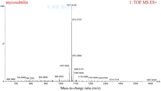 LC-MS analysis of purified mycosubtilin from B. subtilis ATCC6633. The ion peaks at 1057.6, 1071.6, and 1085.6 represent C15, C16, and C17 mycosubtilin homologues, respectively.