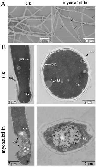 Morphology changes in F. graminearum hyphae induced by 20 μg/mL of mycosubtilin, detected via SEM (A) and TEM (B). CK, 25% (vol/vol) methanol. cw, cell wall; cy, cytoplasm; pm, plasma membrane; ld, lipid droplets.