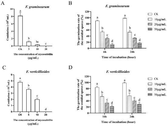 Effects of mycosubtilin on conidial formation and germination of F. graminearum (A,B) and F. verticillioides (C,D). CK, 25% (vol/vol) methanol. Data were analyzed by one-way ANOVA, followed by Duncan’s multiple range test. Line bars represent standard errors of three repeated experiments. Letters a, b, c, and d above the columns represent statistically significant differences (α = 0.05).