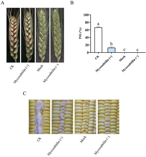 Effects of mycosubtilin on the pathogenicity of F. graminearum (A,B) and F. verticillioides (C) in plants. Mock, solution with 25% (vol/vol) methanol; CK, a conidial suspension with 25% methanol; Mycosubtilin (+), a conidial suspension with 100 μg/mL of mycosubtilin; Mycosubtilin (−), ddH2O containing 100 μg/mL of mycosubtilin. (A) F. graminearum PH-1 was used to infect wheat heads. Black dots on the wheat ears represent the inoculation site; (B) the pathogenicity of F. graminearum was measured by the average PSS. Data were analyzed by a one-way ANOVA, followed by Duncan’s multiple range test. Line bars represent standard errors of three repeated experiments. Letters a, b, and c above the columns represent statistically significant differences (α = 0.05); (C) F. verticillioides 7600 was used to infect maize kernels.