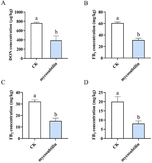 These results demonstrated that treatment with 50 μg/mL of mycosubtilin could reduce DON and FBs production by F. graminearum and F. verticillioides, respectively (Figure 6).
