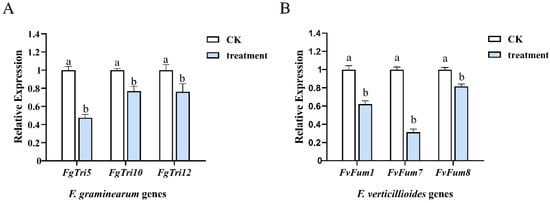 The expression level of DON-related genes of F. graminearum (A) and FBs-related genes of F. verticillioides (B). CK, 25% (vol/vol) methanol. Values were normalized to the levels of the actin gene as an internal reference. Data were analyzed by one-way ANOVA. Line bars represent standard errors of three repeated experiments. Letters a and b above the columns represent statistically significant differences (α = 0.05).