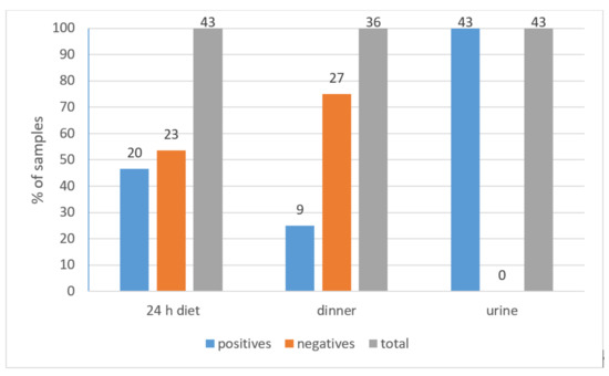 Forty-four participants were selected to participate in the study and provided samples of their 24 h diet, dinner, and first-morning urine. One child did not provide urine, another did not provide their 24 h diet, and eight did not provide dinner samples. In total, we collected 43 urine, 43 24 h diet, and 36 dinner samples for a total of 122 samples. First-morning urine and food were requested to be sampled on the day following the duplicate diet. Both the food and urine samples were collected in cold containers at school on the urine sampling day and after an immediate delivery to the laboratory, they were kept at −18 °C until analysis.
