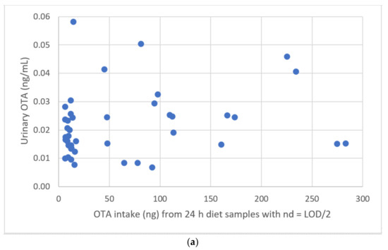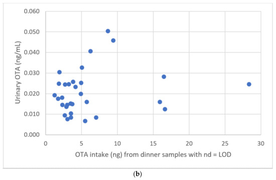 (a) Correlation between OTA concentrations in first morning urines and OTA intake from 24 h diet, (b) correlation between OTA concentration in the first morning urine and OTA intake from the dinner samples.