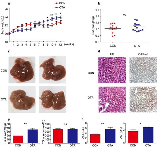 To confirm the effects of OTA in vivo, six-week-old C57BL/6 mice were daily administered with OTA at 1 mg/kg.bw in 0.1 M NaHCO3 (100 μL) for successively 12 weeks (OTA group). Control mice (Control group) received 0.1 M NaHCO3 by gavage similarly. Although OTA mice exhibited slower weight gain than control mice at the early stage, they had a more rapid rise in the body weight after 9-week feeding, suggesting that the long-term effect of OTA exposure on metabolism (Figure 3a). Although liver weights were comparable between control and OTA group (Figure 3b), the livers in OTA group showed a slightly white appearance (Figure 3c). H&E staining of the livers in OTA group showed symptom of fatty liver at early stage (Figure 3d). Furthermore, Oil Red O staining of liver sections revealed significant lipid accumulation in the hepatocytes of mice in OTA group (Figure 3d). Besides, the hepatic TG content was significantly increased in OTA group (Figure 3e), whereas the serum levels of TG in control and OTA groups were comparable (Figure 3e). These findings suggested that OTA treatment led to abnormal lipid metabolism in mice livers. In addition, serum ALT levels and AST levels were increased in OTA group (Figure 3f), indicating liver damage. The above data suggested that 12-week exposure to OTA induced simple steatosis in vivo.