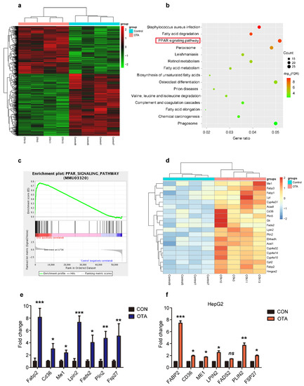 Reprogramming of hepatic gene expression after OTA treatment. (a) Heatmap for clustering analysis of genes in the livers of control and OTA-treated mice. (b) KEGG analysis showing top 15 enriched pathways in OTA-treated livers with p < 0.05. (c) Results of GSEA showed PPAR signaling pathway were differentially enriched upon OTA treatment. (d) Heatmaps of hepatic RNA-seq raw gene counts for PPAR signaling pathway. (e) Examination of top upregulated genes associated with lipid metabolism in livers of control and OTA-treated mice (n = 12 in each group) by qPCR. (f) Examination of top upregulated genes associated with lipid metabolism in HepG2 cells by qPCR (n = 6 biological replicates). Data shown as the mean ± S.E.M. * p < 0.05, ** p < 0.01 and *** p < 0.001.
