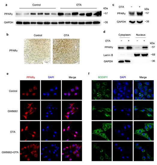 OTA induces hepatic steatosis through upregulation and activation of PPARγ. (a) Western blot analysis of PPARγ expression in livers of control and OTA-treated mice. (b) Immunohistochemical staining of PPARγ in liver tissues of control and OTA-treated mice. (c) PPARγ protein expression in control and OTA-treated HepG2 cells. (d) Western blot analysis showing effect of OTA on PPARγ expression in cytosolic and nuclear fractions of HepG2 cells. (e) Expression and localization of PPARγ under indicated treatment is examined by immunofluorescence. Nuclei were stained with DAPI, and (f) intracellular lipid droplets are labeled with BODIPY.