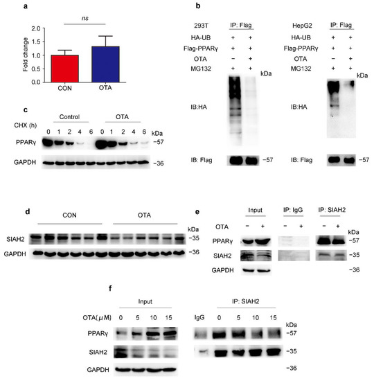 PPARs are representative members of nuclear receptors. This large superfamily is capable of ligand binding, which modulates their activities to regulate gene expression [32]. It has been determined that fatty acids and their derivatives bind and activate PPAR proteins [33]. Therefore, PPARs are important regulators to maintain cellular metabolic homeostasis. Lim et al. reported that OTA notably reduced the expression of adipocyte-specific genes, including PPARγ, therefore inhibited adipogenesis in mesenchymal stem cells derived from human adipose tissue [34]. In contrast, we found that PPARγ protein expression was increased in the livers after OTA treatment, whereas the mRNA level was comparable with control livers. This inconsistence may be attributed to the different cell types. It was reported that prolonged OTA exposure decreased ubiquitination levels of proteins by promoting proteasome activity [35]. However, we observed that OTA increased the PPARγ protein level in our study. We found that the interaction between PPARγ and its E3 ligase SIAH2 was reduced upon OTA treatment. Consequently, OTA prevented degradation of PPARγ. Therefore, OTA may influence protein stability in different ways.