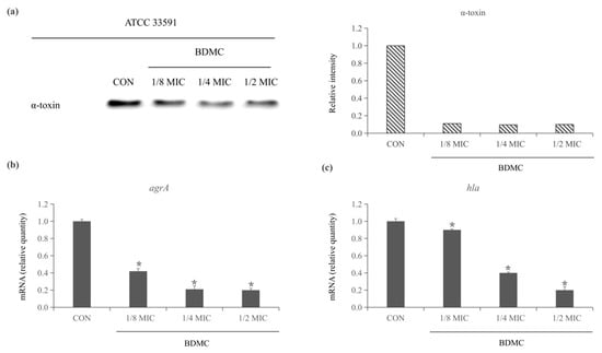 Western blot was examined to evaluate the level of expression of α-toxin treated or untreated with BDMC of sub-inhibitory concentrations. After treatment for 4 h, BDMC production of α-toxin was determined to be significantly suppressed. In the presence of 1/8 MIC of BDMC, the protein level of α-toxin was only detected at 11%. However, as the concentration of BMDC increases, protein levels no longer decrease significantly (Figure 1a). The transcriptional level of the α-toxin gene hla and agrA was quantified by quantitative RT-PCR (qRT-PCR). The concentration of BDMC significantly downregulated the expression of agrA and hla as low as 0.9 µg/mL (1/8 MIC) (Figure 1b,c).