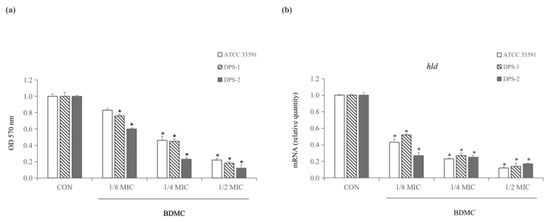 2.2. BDMC Inhibits Biofilm Formation and Downregulated the Expression of hld