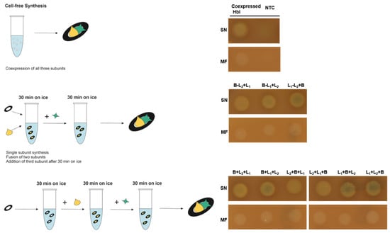 As mentioned above, prior work has shown that Hbl subunits interact with one another and form a tripartite complex as well as pre-pore complexes []. Our eukaryotic cell-free systems offer the possibility to add any number of subunit encoding genes and supplements to the cell-free synthesis as a prerequisite to study the embedding of the Hbl enterotoxin into endogenous membranous structures present in our lysates. Such microsomes were derived from the endoplasmic reticulum, retaining their activity throughout the entire lysate preparation procedure []. In order to establish the synthesis of the Hbl tripartite enterotoxin, all subunits were produced individually in separate reactions. As an experimental alternative, two subunits as well as all three subunits were synthesized simultaneously within the same cell-free reaction compartment (coexpression). After the synthesis, the crude translation mixture (TM) was fractionated into the soluble fraction (supernatant, SN) and the microsomal fraction (MF) as represented in Figure 1.