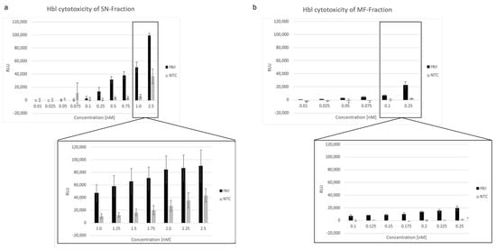As the hemolytic activity in blood agar plates is a qualitative measure, the functional activity of the Hbl complex was further assessed using propidium iodide (PI) uptake studies on CaCo2 cells. The Hbl complex is known to form pores in cell membranes []. Therefore, the ability to perforate cell membranes was studied with PI. PI cannot cross the intact cell membrane but when a pore is present within the membrane, PI can enter the cell. It then intercalates with nucleic acids and its emission maximum shifts from 590 nm to 617 nm. Thus, a PI uptake assay reflects the membrane perforation caused by the Hbl complex. Varying concentrations of the coexpressed complex were screened to evaluate the toxic dose on 10,000 CaCo2 cells. The soluble coexpressed subunits induced initial toxic effects at 0.25 nM. The equivalent NTC volume did not result in toxic effects. The toxic effect of the Hbl complex increased with increasing concentrations, which were measured from 0.01 nM up to 2.5 nM (Figure 6a top). Initial toxic effects could be detected at 0.1 nM, but a toxic effect that could precisely be distinguished from the NTC background activity was observed at 0.25 nM. To monitor the concentration range from 1 to 2.5 nM in detail, a second data set was acquired. These data depicted that an increased Hbl concentration showed defined differences in the membrane perforation process even when the concentration was only increased by 0.25 nM (Figure 6a, bottom). To assess the toxicity of the MF fraction a similar concentration range was screened as for the SN fraction. In general, the MF fraction resulted in lower total protein yields compared to the SN fraction. Therefore, the highest concentration tested in the PI assay for the MF fraction was 0.25 nM, the lowest 0.01 nM. This data set clearly depicted initial toxic effects at 0.05 nM (Figure 6b, top). Nonetheless, precise toxic effects were seen at starting concentrations of 0.1 nM. Due to the normalization using the medium control, the NTC showed negative fluorescence counts as the medium treated cells displayed higher background values than the NTC between the 0.01 and 0.075 nM volume equivalents. The concentration range between 0.1 nM and 0.25 nM was monitored in addition. Again, even small increases of the Hbl complex concentration, increased the membrane disruption (Figure 6b, bottom). Analyzing the lysate background from the SN and the MF fraction, the PI uptake assay demonstrated less intense values for the NTC in the MF. The SN showed high NTC values at high concentrations. Overall, these data support the previous findings that both, SN and MF fractions, harbor functionally active Hbl complex.