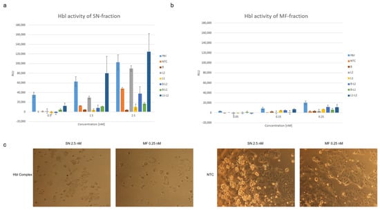 The putative toxicity of the individual subunits as well as of two coexpressed subunits was evaluated. Individual subunits and two coexpressed subunits were compared to a coexpressed tripartite toxin complex. An NTC in a volume equivalent to the tripartite complex was analyzed in parallel. Three different concentrations were used for the SN and the MF fraction. At 0.5 nM the Hbl complex in the SN fraction showed cytotoxic activity, while the single subunits and two coexpressed subunits did not (Figure 7a). Analyzing the soluble subunits and two coexpressed subunits at 0.5, 1.5 and 2.5 nM revealed that with rising concentrations, the fluorescence intensity of L2 was on the same level as the Hbl complex, while coexpressed subunits L1 and L2 were even higher as the coexpressed tripartite toxin (Figure 7a), which suggests a pre-pore formation interacting with the cell membrane. The evaluation of the MF showed that no individual subunit and no coexpression of two subunits led to fluorescence counts as high as detected for the Hbl complex (Figure 7b). Strikingly, coexpressed B and L2 as well as L1 and L2 at 0.25 nM led to an increase in RLU but still the highest values were detected for the coexpressed Hbl. In order to assess these data, a morphological analysis of CaCo2 cells subjected to the Hbl complex, its single subunits and two coexpressed subunits was performed. Therefore, the SN fractions were administered to CaCo2 cells at a final concentration of 2.5 nM and the MF fractions were administered at 0.25 nM for 4 h in accordance to PI uptake assays. The Hbl complex perforated the cells leading to cell death whilst the NTC did not (Figure 7c). Strikingly, SN and MF both showed strong cytotoxic effects on CaCo2 cells. Single subunits and two coexpressed subunits did not induce cell death. Cells exposed to the SN fraction of coexpressed L1:L2 subunits showed a reduced confluency, suggesting a pre-pore formation attacking the cells (Figure S8).