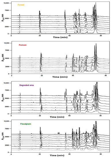 Chromatographic analyses by RP-HPLC were our first approach to investigate the individual variability of B. atrox venoms among the specimens collected in each habitat: forest, pasture, degraded area, and floodplain. Overall, similar profiles can be seen in all chromatograms, although the relative heights or areas of peaks varied greatly between venoms even among snakes collected at the same habitat (Figure 1 and Supplementary Figure S1, for individual chromatograms). In all venom chromatographies, the highest peaks were eluted after 80 min, while peaks eluted between 50 and 70 min showed the most variable area percentages, being higher in floodplain venoms and lower in pasture venoms. According to our previous study [15], Snake Venom Metalloproteinases (SVMPs) are the main components eluted after 80 min, while Phospholipases A2 (PLA2s), C-type Lectin-like proteins (CTLs), and Snake Venom Serine proteinases (SVSPs) are the prevalent protein families in the fractions eluted in the intermediate steps (50–70 min).