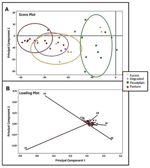 First, we identified the population-level differentiation among venoms of snakes collected at the different habitats, based on the individual venom composition of each group of snakes. The PERMANOVA analysis (Table 1) showed that the environment explained 22.5% of the total variation in venom peak abundances in the sampled snakes (df = 3.33, F = 3.2, p < 0.0001). Further exploration of these differences with compositionally robust PCA (Figure 2, score plots) showed that PC1 largely differentiates floodplain from pasture venoms. Forest and degraded venoms occupying an intermediate space on the PC1 axis. Components with the most prominent loadings are fraction 10 and the fractions eluted after 85 min. The highest negative values of PC1, responsible for clustering the pasture venoms, were fraction 23 (PC1 = −0.7308, PC2 = −0.6035) and fraction 21 (PC1 = −0.5028, PC2 = −0.6410). These fractions were characterized in our previous study [15] as PIII-class and PI-class SVMP isoforms, respectively. The highest positive values of PC1, responsible for clustering the floodplain venoms, were fraction 20 (PC1 = 0.2958, PC2 = −0.3732), fraction 24 (PC1 = 0.1241, PC2 = 0.2006), and fraction 10 (PC1 = 0.2284, PC2 = −0.0353), which in our previous study have been characterized as different isoforms of the PIII-class and PI-class SVMPs, with minor proportions of CTL isoforms, and an SVSP, respectively (Figure 2, loading plots).