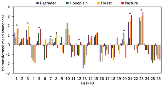 Variation in the chromatographic fractions in B. atrox snakes from different habitats. The centered log-ratio mean abundance for each reversed-phase high-performance liquid chromatography peak was plotted. Negative numbers correspond to low-abundance peaks, whereas positive numbers correspond to high abundance peaks. (*) Asterisks indicate peaks that show significant population-level variation. X-axis labels correspond to RP-HPLC peak numbers (1 to 26).