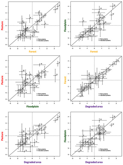 We also investigated whether the venom variability in B. atrox groups would be associated with the degree to which the venom proteins were expressed in the different habitats. RP-HPLC peaks for each habitat were classified into two sets: low or high abundance, based on the clr-transformed mean of each peak and a nonparametric MANOVA analysis, as previously described [23], where rare proteins = the mean of an individual peak < the geometric mean, and abundant proteins = mean of an individual peak > the geometric mean (Figure 4). Proteins showing deviations off the middle line are those in which the expression levels are different between the compared populations whereas those that are on the line are similar.