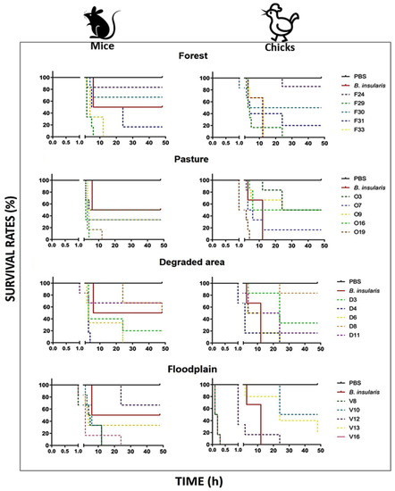 Finally, to link functional variation to toxicity to specific prey, we decided to investigate the ability of the venoms from each habitat to kill rodents (mice) or birds (chicks). We also quantify individual variation in venom-induced lethality within the same habitat. Venoms from five specimens from each habitat were injected into groups of six mice or six chicks, and the time of death of the animals was monitored over 48 h (Figure 6).
