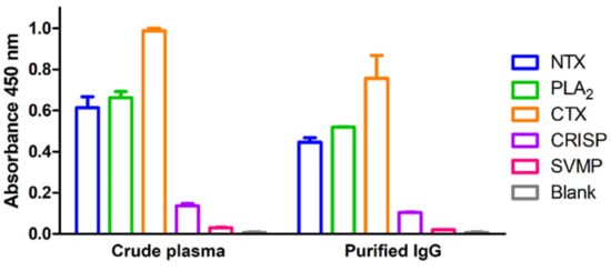 Immunorecognition of five toxic proteins of N. atra venom by hyperimmunized horse plasma and caprylic acid-purified IgG. Each of the five snake venom proteins was coated on a 96-well ELISA plate (10 ng/well), and crude equine plasma (1:20,000 dilution) and caprylic acid-purified IgG (1:20,000 dilution) with high neutralization potency applied to develop ELISA signals. Each data point represents mean ± SD of triplicate experiments.