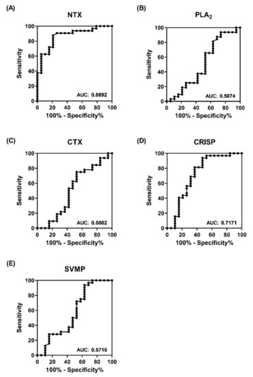 Power of protein-based ELISA for discriminating high-potency from low-potency equine plasma. ROC curves of ELISA signals towards (A) NTX, (B) PLA2, (C) CTX, (D) CRISP, and (E) SVMP for differentiating between high- and low-potency plasma. The value of the area under the curve (AUC) denotes the power of target analytes in the classification of high- and low-potency horse plasma.