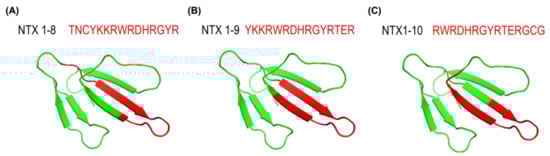 Three-dimensional structure of NTX protein (P60770) from N. atra. The structure image was created using Mol* Viewer (https://molstar.org/viewer/, accessed on 15 November 2021). The relative positions of (A) NTX1-8, (B) NTX1-9, (C) NTX1-10 in the NTX homology model are depicted in red.
