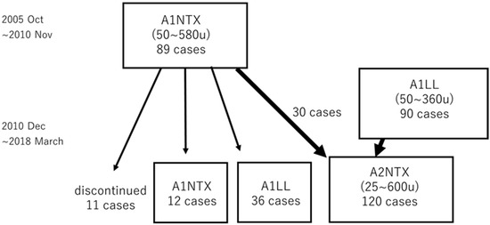 Flow chart of the subjects with respect to the toxin preparations. The first part from 2005 to 2010 included A1NTX. A1LL had been used for cervical dystonia and blepharospasm (max. dose 240 units) before 2010 in Japan and was approved for upper and lower limb spasticity in 2010 (max. dose 360 units). After IRB approval, those who had A1LL and A1NTX switched to A2NTX for the second part of the study.