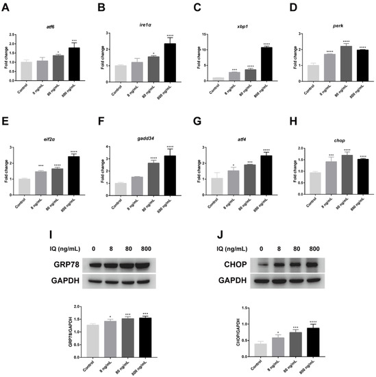 TEM revealed ERS in zebrafish livers. To confirm ERS after IQ exposure, we analyzed ERS-related genes and proteins. As presented in Figure 2A–H, the gene expression of atf6 (p = 0.0002), ire1α (p < 0.0001), xbp1 (p < 0.0001), perk (p < 0.0001), eif2α (p < 0.0001), gadd34 (p < 0.0001), atf4 (p < 0.0001), and chop (p < 0.0001) raised significantly after IQ exposure. The levels of GRP78 and CHOP, ERS marker proteins, were detected in zebrafish livers. Western blot analysis showed that GRP78 (p = 0.0006) and CHOP (p < 0.0001) were enhanced by all doses of IQ (Figure 2I,J). These results suggested that IQ induced ERS in hepatocytes.