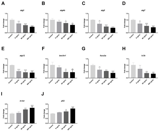 TEM results showed that IQ observably inhibited autophagic formation in zebrafish livers. Autophagic vacuoles, including autophagosomes and autolysosomes, presented in hepatocytes in the Control Group, but they were rarely observed after IQ exposure (Figure 1B). To verify the alterations in autophagic response, we investigated whether the function of autophagy was impaired in zebrafish livers after IQ exposure through analyzing autophagy-related genes and proteins. As presented in Figure 3, IQ exposure significantly inhibited the gene expression of atg3 (p < 0.0001), atg4b (p = 0.0037), atg5 (p < 0.0001), atg7 (p < 0.0001), atg12 (p < 0.0001), beclin1 (p = 0.0020), foxo3a (p < 0.0001), and lc3b (p = 0.0004) in a dose-related manner. The transcription of m-tor and p62 significantly increased in all IQ-exposed groups (p < 0.0001). As shown in Figure 4, compared with the Control Groups, the protein expression levels of Atg5-Atg12, Beclin1, and LC3-II were decreased, but p62 was increased after IQ exposure (p < 0.0001). These results suggested that autophagic formation was inhibited after IQ exposure.