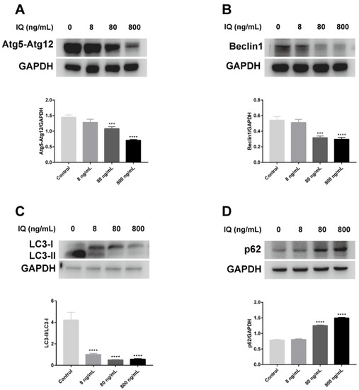 Effects of IQ on the expression of autophagy-related proteins in the liver of zebrafish. (A–D) Western blot analyses of Atg5-Atg12, Beclin1, LC3-II, and p62. *** p < 0.001, **** p < 0.0001 (n = 3).