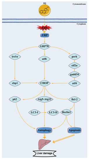 Schematic representation of endoplasmic reticulum stress (ERS), autophagy, and apoptosis in zebrafish liver induced by IQ exposure.