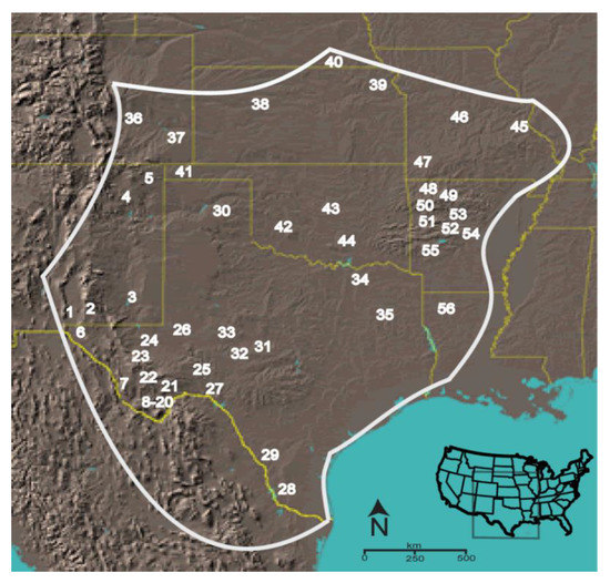 Approximate geographic range of C. vittatus with populations numbered as surveyed in a phylogeographic analysis [24]. The populations selected for the putative sodium β toxin gene diversity analysis are the following: (1) Aguirre Springs (AgSP), (6) Hueco Tanks (HT), (7) Chinati Hot Spring (Chin), (20) Boquillas Canyon Road (BCR), (30) PaloDuro (PaDu), (37) Lake Pueblo (LPb), (39) Lawrence (KS), (40) Little Blue River (LBR), (41) Black Mesa (BMe), (46) Ha Ha Tonka (Ha), (53) Scottsville (Scv), and (56) Kisatchie (Kisa).