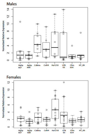 Box plots of normalized relative expression values for eastern population males (n = 8) and females (n = 13) with eight putative sodium β toxin genes. Normalized relative expression values (open circles for each individual) represent sodium β toxin genes adjusted to reference gene expression. The error bars represent SEMs. The only significant differences exist in females with Ha1210 to Chin654, AgSp668, and CvIV4 (see below).