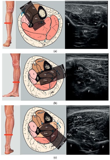 Right to left: Probe position to evaluate tibialis posterior on the axial plane; Anatomical scheme of axial section of the leg correlated with US scan; representative US axial real scan, healthy subject. (a) Anterior approach; (b) Posteromedial approach; (c) Posterior approach. Abbreviations: TA tibialis anterior muscle; EDL extensor digitorum longus muscle; TP tibialis posterior muscle; SOL soleus muscle; FDL flexor digitorum longus muscle; FHL flexor hallucis longus muscle; T tibia; F fibula; im interosseous membrane; * neurovascular bundle.
