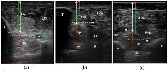 Real ultrasound images of a patient enrolled in the study, affected side. Parameters measured with ultrasonography evaluating the (a) Anterior approach; (b) Medial approach; (c) Posterior approach. Orange line: subcutaneous tissue thickness; Green line: overlying muscle thickness; White arrow: TP muscle depth; Red arrow: TP muscle thickness; Yellow dotted arrow: safety window. Abbreviations: TA tibialis anterior muscle; EDL extensor digitorum longus muscle; TP tibialis posterior muscle; SOL soleus muscle; FDL flexor digitorum longus muscle; FHL flexor hallucis longus muscle; T tibia; F fibula; im interosseous membrane; * neurovascular bundle.