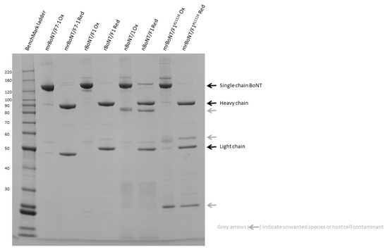 - Hackett, G.; Moore, K.; Burgin, D.; Hornby, F.; Gray, B.; Elliott, M.; Mir, I.; Beard, M. Purification and Characterization of Recombinant Botulinum Neurotoxin Serotype FA, Also Known as Serotype H. Toxins 2018, 10, 195. [Google Scholar] [CrossRef] [Green Version]